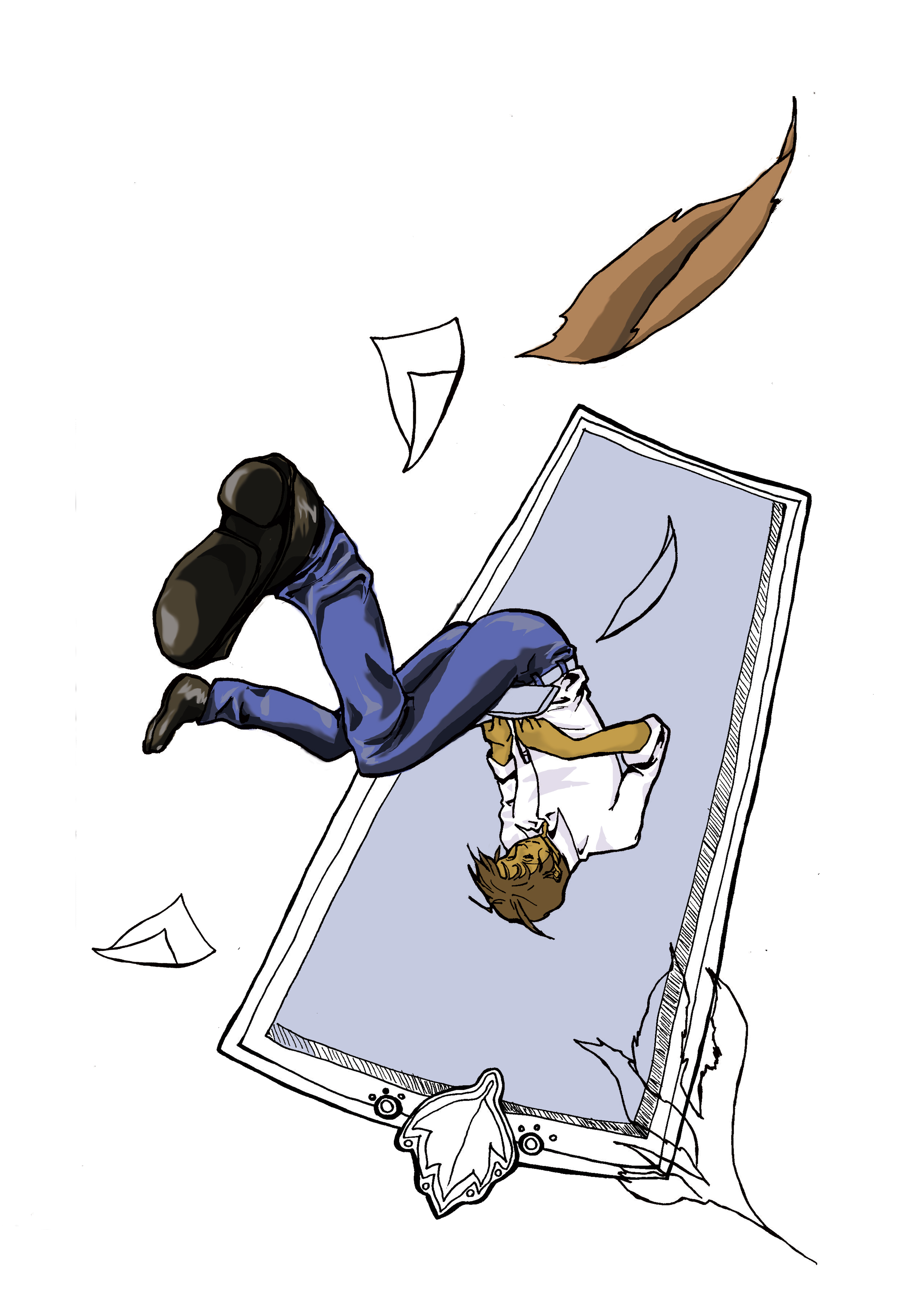 The hardest part about this project? The actual concept. I hate re-using other motifs, and if I have to, I’d rather just not do it or tackle it in a different way. I pulled out the most famous part of Alice in Wonderland–falling down the rabbit hole–and replaced Alice with a man working on something because this is the busiest time for English teachers.