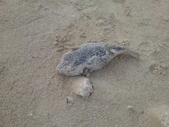 My husband and I took a spontaneous trip to a nearby beach a day after the type 4 (out of 5) typhoon. As we walked through the debris of trees from the night before, we found a few dead fish on the shoreline. One was a small flounder fish, but one fish was blue with spots. “It’s a pufferfish!” my husband exclaimed upon closer inspection.